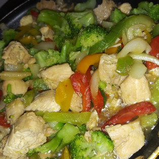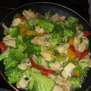 We seasoned the chicken with pepper and onion powder, and added our stir fry mix when the chicken was almost done cooking.